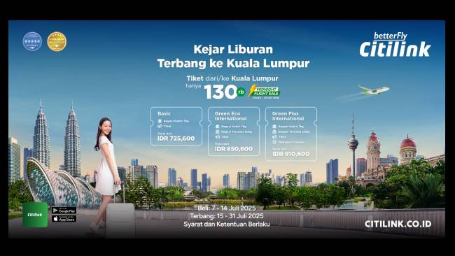 Yuk ke Kuala Lumpur bersama teman-teman. Terbang bareng Citilink ke Kuala Lumpur hanya 130 ribu untuk pemesanan tiket di Midnight Flight Sale dari tanggal 7-14 Juli 2025 setiap pukul 00.00 – 03.00 WIB di citilink.co.id atau Aplikasi Citilink.